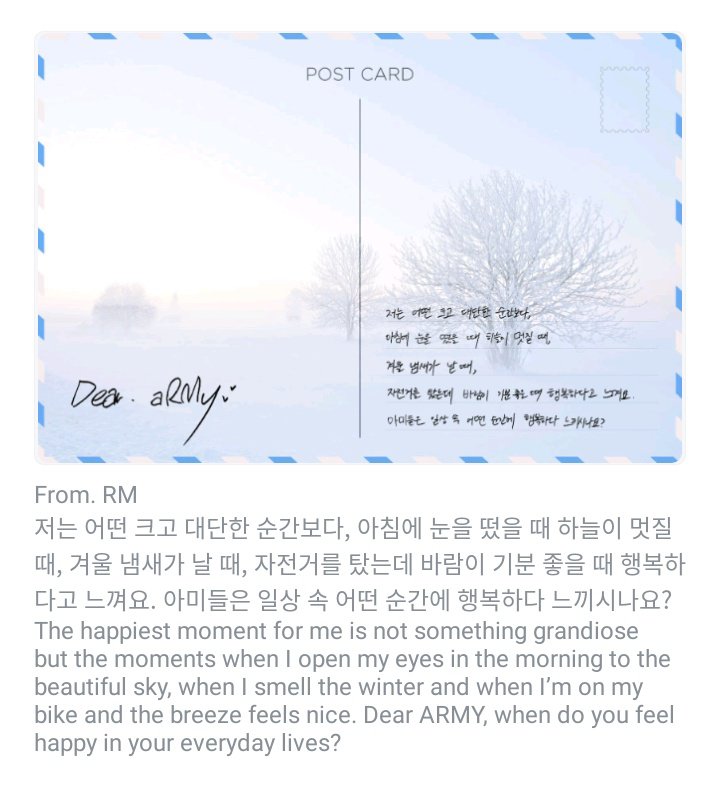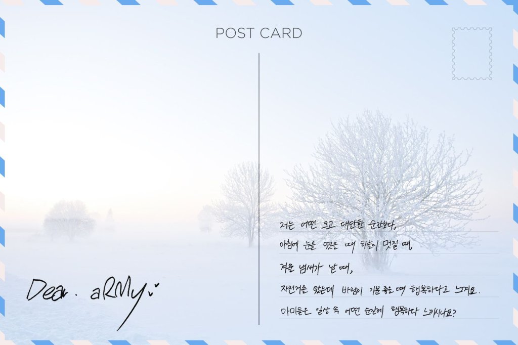 Dari tujuh orang pangeran tampan kebanggaan ARMY dan dari Korea Selatan ini, baru tiga orang yang memberikan post card nya, yang membuat hati amburadul, menangis, tertawa, tersenyum, guling-guling kesana kemari 😭