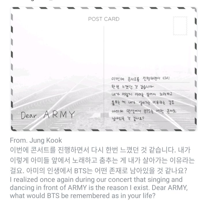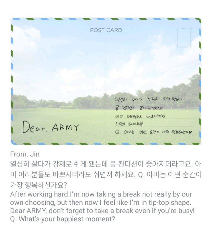 Di tanggal yang sama, BTS Jin dan Jungkook mengirimkan kartu pos mereka. Bangtan Sonyeondan atau BTS juga bisa dijadikan salah satu contoh dari sekian banyaknya pemuda dunia yang menginspirasi, memberikan contoh yang baik.